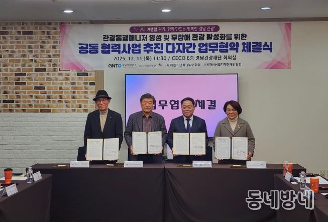 동네방네 김형규 기자 | 경상남도관광재단은 11일 오전 12시 창원컨벤션센터에서 경상남도가족센터, 대한노인회 경남연합회, 경상남도지체장애인협회와 무장애 관광 활성화를 위한 다자간 업무협약을 체결했다고 밝혔다.