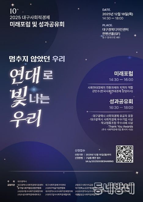 동네방네 김형규 기자 | 대구광역시와 대구사회적경제지원센터는 12월 18일 오후 2시 30분, 대구경북디자인센터 컨벤션홀에서 지역 사회적경제 기업인 및 유관 단체 관계자 등 120여 명이 참석한 가운데 ‘2025 대구 사회적경제 미래포럼 및 성과공유회’를 개최했다.