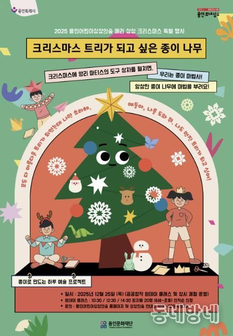 동네방네 김형규 기자 | 용인문화재단은 오는 12월 25일에 크리스마스를 맞아 용인어린이상상의숲과 용인문화도시플랫폼 공생광장 일원에서 다양한 문화예술 프로그램을 즐길 수 있는 크리스마스 특별행사를 개최한다.