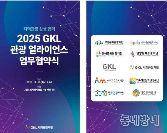 동네방네 김형규 기자 | 여주세종문화관광재단은 지난 12월 16일 GKL 사회공헌재단이 주관한 ‘GKL 관광 얼라이언스 업무협약식’에 참석하여, 전국 8개 지역관광 전담기관과 함께 문화·관광 분야 공익사업 협력을 위한 업무협약을 체결했다고 밝혔다.