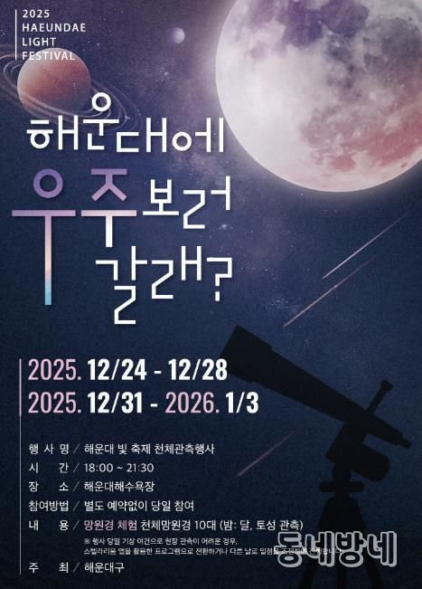 동네방네 김형규 기자 | 해운대구가 해운대빛축제 특별 이벤트 ‘우주 보러 갈래’를 12월 24~28일, 12월 31일~1월 3일에 운영한다.