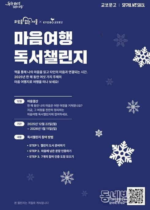 동네방네 김형규 기자 | 서울시가 ‘외로움 없는 서울’을 만들기 위한 노력의 일환으로 교보문고와 함께 여섯 번째 ‘마음여행 독서챌린지’를 진행한다. 이번 챌린지는 ‘마음결산’을 주제로, 올해 나의 마음을 움직인 책과 그 속에서 기억에 남는 문장을 선택해 ‘2025 마음결산 리포트’를 완성하며 한 해의 여정을 마무리한다.