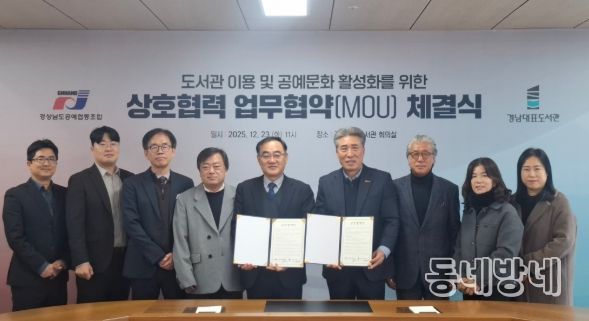 동네방네 김형규 기자 | 경남대표도서관(관장 강순익)은 23일 오전 11시 경남대표도서관 회의실에서 경상남도공예협동조합(이사장 허일)과 도민의 공예문화 향유 기회 확대 및 도서관 이용 활성화를 위한 업무협약을 맺었다고 밝혔다.