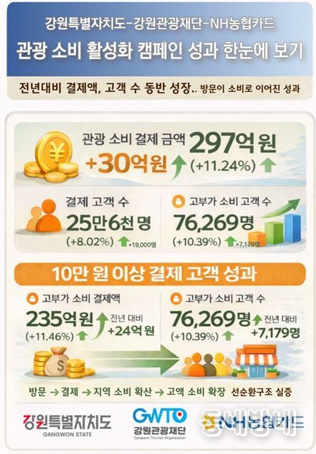 동네방네 김형규 기자 | 강원특별자치도와 강원관광재단은 NH농협카드와 함께 추진한 ‘강원 관광소비 활성화 상생 캠페인’ 결과, 전년 동일 기간 대비 관광 소비 금액과 결제 고객 수가 모두 증가하며 실질적인 지역 소비 활성화 성과를 거둔 것으로 나타났다.