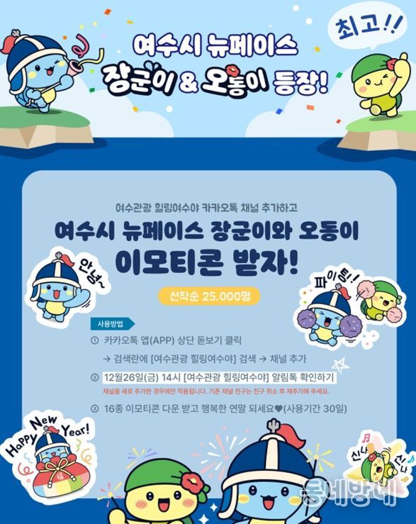 동네방네 김형규 기자 | 여수시가 새롭게 리뉴얼된 마스코트 ‘장군이·오동이’ 카카오톡 이모티콘을 오는 26일 오후 2시부터 선착순 2만 5천 명에게 무료로 배포한다고 밝혔다.