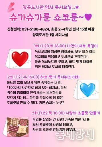 동네방네 김형규 기자 | 김포시는 2026년 1월 20일 오후 4시부터 6시까지 1층 세미나실에서 초등학교 2~4학년을 대상으로 한 역사 독서교실 '슈가슈가룬 쇼코룬'을 운영한다.