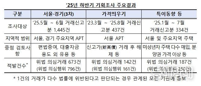 이번 기획조사는▴서울·경기 주택 이상거래(’25.5월~6월 거래신고분),▴부동산 실거래가 띄우기(’23.3월~’25.8월 거래신고분), ▴특이동향 등(’25.1월~7월 거래신고분) 3가지 분야에 대해 실시됐다.