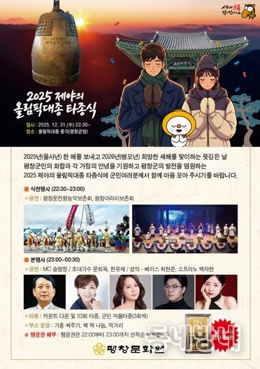 동네방네 김형규 기자 | 평창문화원은 다가오는 12월 31일 22시 30분부터 2025년 을사년을 마무리하고 희망찬 2026년 병오년 새해를 기원하는 2025년 제야의 올림픽대종 타종행사를 개최한다.