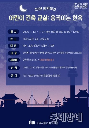 동네방네 김형규 기자 | 고양특례시 가좌도서관은 2026년 1월 13일부터 27일까지 매주 화요일 3회차에 걸쳐 방학특강 프로그램 ‘어린이 건축 교실: 움직이는 한옥’을 운영한다고 밝혔다.