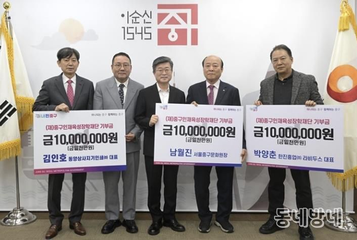 동네방네 김형규 기자 | 서울 중구 인재육성장학재단이 지난 29일 장학재단 이사진과 청소년들로부터 지역 인재 양성을 위한 장학금 총 5,100만 원을 기탁받았다고 밝혔다.