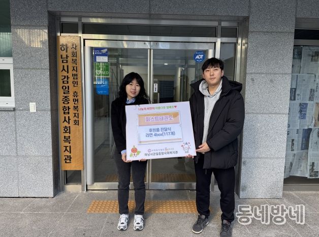 동네방네 김형규 기자 | 감일퍼스트태권도장(관장 이양성)은 지난 12월 26일 하남시감일종합사회복지관(사회복지법인 휴먼복지회 운영)에 ‘사랑의 라면트리’ 라면 117개를 전달했다.