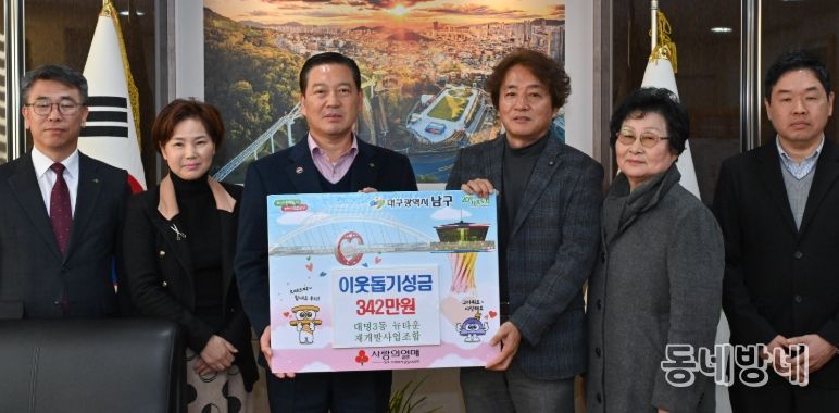 동네방네 김형규 기자 | 대구 남구는 대명3동 뉴타운 재개발사업 조합의 조합장(이대룡)을 비롯한 임원, 대의원 및 직원이 지난 2025년 12월 30일 연말을 맞아 어려운 이웃을 위해 써달라며 정성껏 모은 성금 342만원을 기탁했다고 밝혔다.