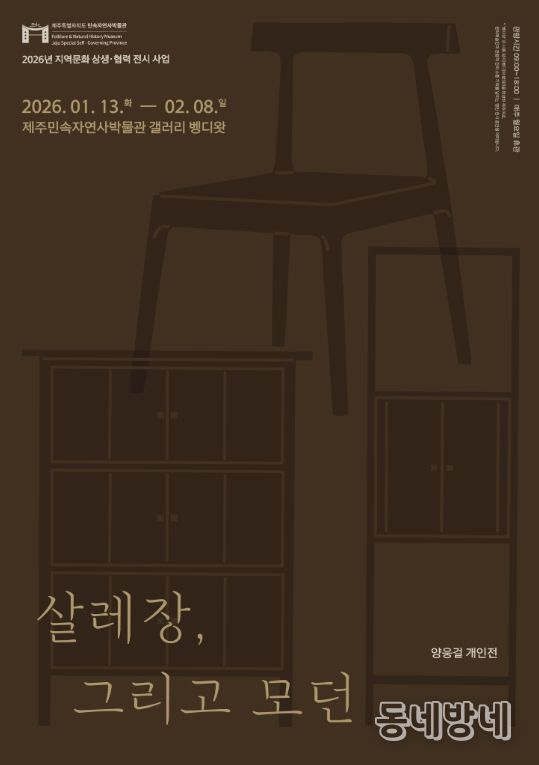 동네방네 김형규 기자 | 제주민속자연사박물관은 ‘지역문화 상생·협력 전시 사업’의 일환으로 1월 13일부터 2월 8일까지 갤러리 벵디왓에서 양웅걸 개인전 '살레장, 그리고 모던'을 개최한다.