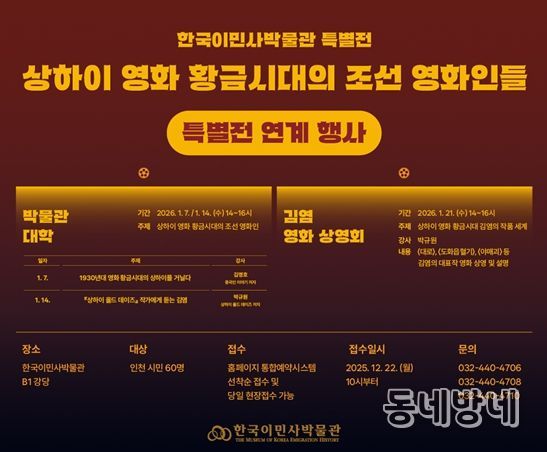 동네방네 김형규 기자 | 인천광역시 시립박물관 분관 한국이민사박물관은 특별전 〈상하이 영화 황금시대의 조선 영화인들〉과 연계해 『상하이 올드 데이즈』의 저자 박규원 작가를 초청한 특강을 개최한다.