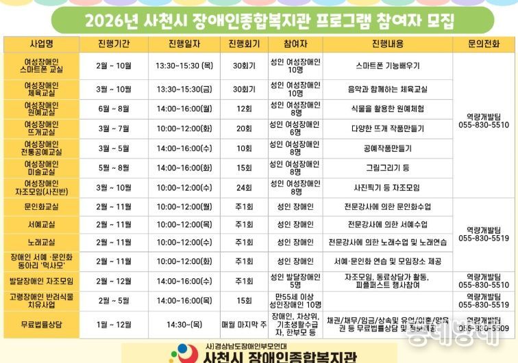 동네방네 김형규 기자 | 사천시장애인종합복지관은 장애인의 삶의 질 향상과 사회참여 확대를 위해 2026년 프로그램의 참여자를 모집한다.
