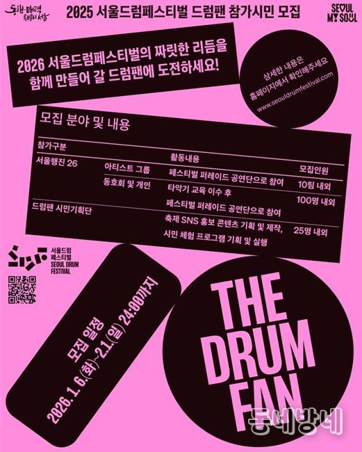 동네방네 김형규 기자 | 서울시는 오는 5월 동대문디자인플라자(DDP)에서 개최되는 ‘2026 서울드럼페스티벌’을 앞두고 축제의 주인공으로 활약할 ‘드럼팬(Drum Fan)’ 시민 참여자를 2월 1일까지 모집한다. 올해 축제는 단순 관람을 넘어 시민이 직접 기획하고 참여하는 ‘시민 주도형’ 축제가 될 것으로 기대된다.