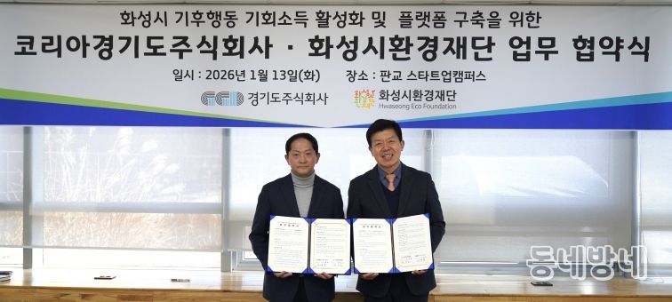 동네방네 김형규 기자 | 경기도주식회사는 13일 경기도 성남시 판교 스타트업캠퍼스에서 화성시환경재단과 ‘기후행동 기회소득 활성화 및 화성시 플랫폼 구축을 위한 업무협약’을 체결했다.