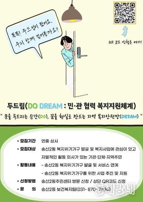 참여를 희망하는 기관‧단체‧지역 주민은 ‘두드림(DO DREAM) 모집’ 안내문을 통해 송산2동 주민센터에 문의하거나 QR코드를 통해 신청서를 제출하면 된다. 모집은 연중 상시 진행되며, 세부 사항은 송산2동 보건복지팀(031-870-7696)으로 문의하면 안내받을 수 있다.