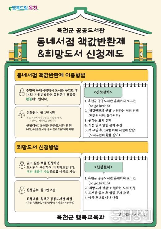 동네방네 김형규 기자 | 옥천군에서 운영하는 ‘동네서점 책값반환제’와 ‘희망도서 신청제도’가 군민들의 높은 호응을 얻고 있으며, 지역 독서문화 활성화에 기여하고 있다.