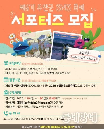 동네방네 김형규 기자 | 부안군은 오는 19일부터 30일까지 부안의 대표 축제를 홍보할 제6기 부안군 SNS 축제 서포터즈’를 모집한다.