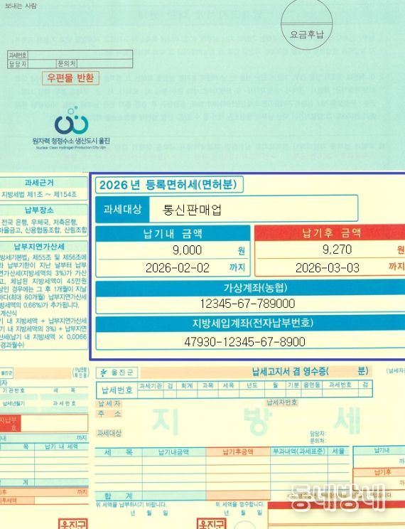 동네방네 김형규 기자 | 울진군은 2026년도 1월 정기분 등록면허세(면허분) 12,028건에 대해 1억 4천 8백만 원을 부과했다.