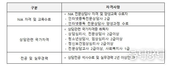 선발 자격은 ▲한국지능정보사회진흥원 시행 인터넷 중독 전문상담사 2급 자격증 소지자 ▲인터넷중독 전문인력 양성교육 이수자 등 관련 자격을 갖춘 인력이다.