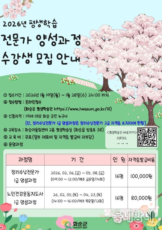 동네방네 김형규 기자 | 화순군은 1월 19일부터 1월 28일까지 ‘2026년 상반기 평생학습 전문가 양성과정’ 수강생을 모집한다고 밝혔다.
