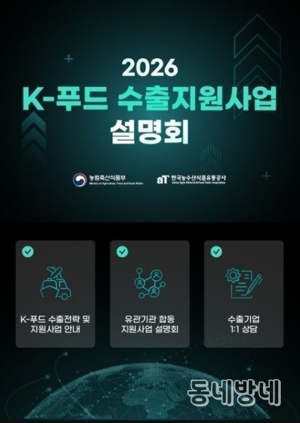 동네방네 김형규 기자 | 농림축산식품부는 K-푸드의 글로벌 진출 확대를 위해 전년보다 900억원 증가한 7,070억원 규모의 2026년 K-푸드 수출지원사업 설명회를 1월 23일 서울 과학기술컨벤션센터에서 개최한다고 밝혔다.