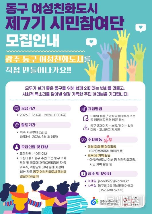 동네방네 김형규 기자 | 광주 동구는 주민이 직접 참여해 여성친화도시 정책을 만들어가는 ‘제7기 동구 여성친화도시 시민참여단’을 이달 30일까지 모집한다고 밝혔다.