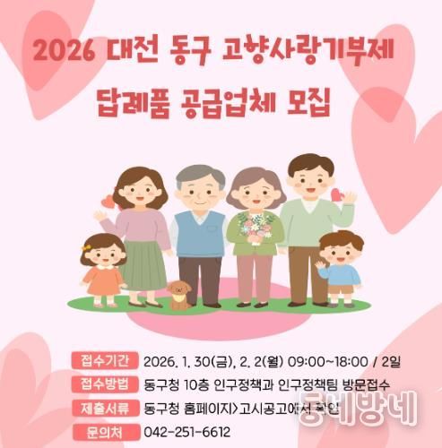 동네방네 김형규 기자 | 대전 동구는 이달 30일부터 다음 달 2일까지 주말을 제외한 이틀간, ‘2026년 고향사랑기부제 답례품 공급업체’를 추가 공개 모집한다고 20일 밝혔다.