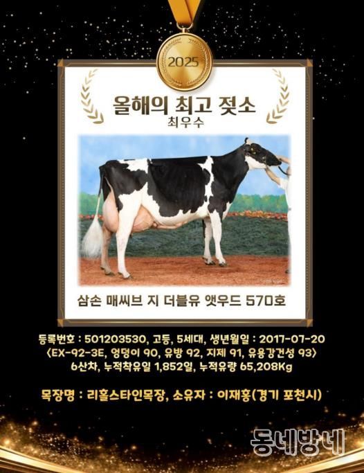 동네방네 김형규 기자 | 포천시는 관내 낙농농가인 리홀스타인목장(대표 이재홍)이 2025년 ‘올해의 최고 젖소’를 배출했다고 밝혔다.