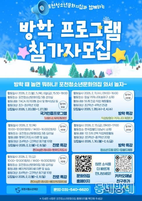 동네방네 김형규 기자 | 포천시청소년재단이 운영하는 포천청소년문화의집은 청소년들의 진로 탐색과 창의 역량 강화를 위한 겨울방학 프로그램 참가자를 모집한다.