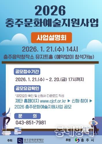 동네방네 김형규 기자 | (재)충주문화관광재단은 충주시 예술인 및 예술단체의 창작활동 기반을 마련하여 문화예술 생태계를 조성하고자 1월 19일부터‘2026 충주문화예술지원사업’공모를 진행하고 있다고 밝혔다.