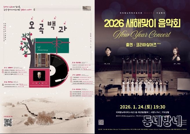 대표 프로그램으로는 오는 24일 오후 7시 30분, 도서관 1층 계단형 관람석에서 열리는 ‘2026 새해맞이 음악회’가 있다. 음악회에는 코리아싱어즈 합창단, 오카리나 연주자 김욱, 클라리네티스트 김예원 등이 출연해 새해의 희망을 전하는 공연을 선보인다.