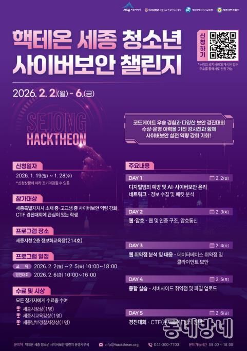 세종특별자치시는 오는 28일까지 관내 중고등학생을 대상으로 핵테온 세종 청소년 사이버보안 챌린지 참가자를 모집한다고 밝혔다.
