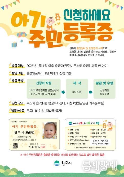 동네방네 김형규 기자 | 원주시는 출산 장려 및 민원 편의를 위해 ‘아기주민등록증’ 무료 발급 사업을 올해도 지속해서 추진한다.