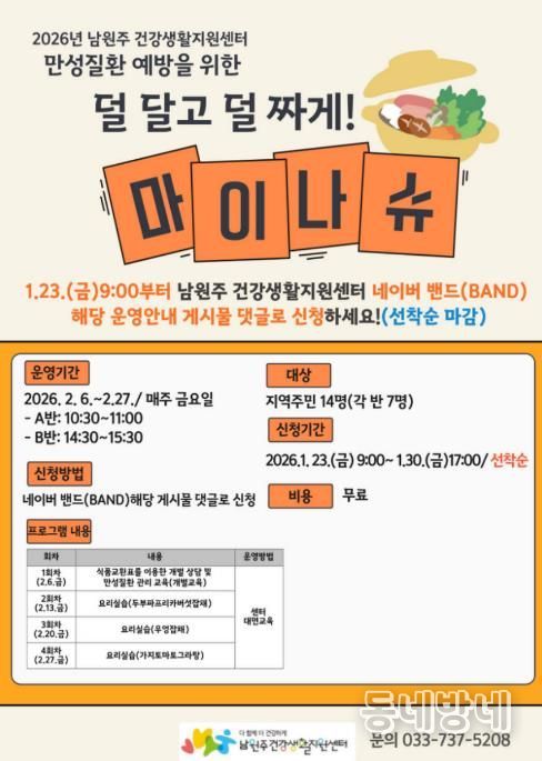 동네방네 김형규 기자 | 남원주건강생활지원센터는 지역 주민의 만성질환 예방과 관리를 위해 ‘덜 달고 덜짜게! 마이나슈 요리교실’ 프로그램 참여자를 모집한다.