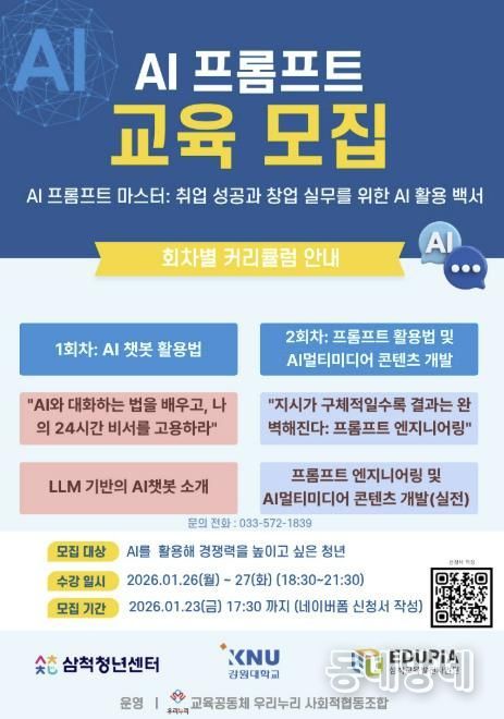 삼척청년센터 관계자는 “AI 기술을 단순한 정보 습득 도구가 아닌 청년들의 취업과 창업 경쟁력을 높이는 실질적 역량으로 연결하기 위해 이번 교육을 마련했다”며 “AI 활용에 관심 있는 시민들의 많은 참여를 기대한다”고 말했다.
