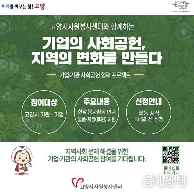 한편, 고양시자원봉사센터는 작년 총 13개 기업·기관과 협력해 489명의 임직원이 참여하는 사회공헌 활동을 추진했으며, 환경정화 및 생태 보호, 취약계층 지원 등 지역사회 문제해결을 위한 다양한 프로그램을 운영한 바 있다.