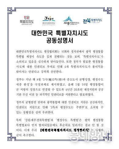 동네방네 김형규 기자 | 세종·제주·강원·전북 4개 특별자치시도가 광역 행정통합에 따른 역차별을 우려하며 행정수도특별법을 비롯한 4개 특별자치시도 관련 특별법의 조속한 제정을 거듭 촉구했다.