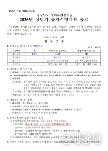 동네방네 김형규 기자 | 합천군은 1월 20일부터 2월 6일까지 경상남도 농어촌진흥기금 융자 신청을 읍·면사무소에서 접수한다.