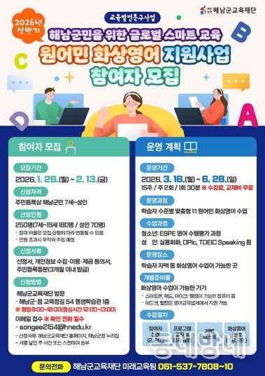 동네방네 김형규 기자 | 재단법인 해남군교육재단(이사장 명현관)은 상반기 원어민 화상영어 지원사업의 참여자를 모집한다. 지난 2023년부터 시작된 원어민 화상영어 지원사업은 군민 누구나 양질의 영어 교육을 받을 수 있도록 해 지역 내 교육 불균형을 해소하고, 미래 글로벌 인재 양성에 기여하기 위해 운영되고 있다.