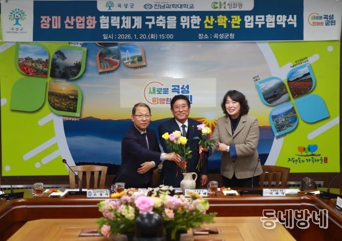 동네방네 김형규 기자 | 전남 곡성군은 장미산업화의 본격적인 추진을 위해 지난 20일 군청 소통마루에서 전남과학대학교, 주식회사 청화팜(대표 이화숙)과 함께 ‘곡성군 장미산업화 및 RISE 연계 산·학·관 협력체계 구축을 위한 업무협약’을 체결했다고 21일 밝혔다.