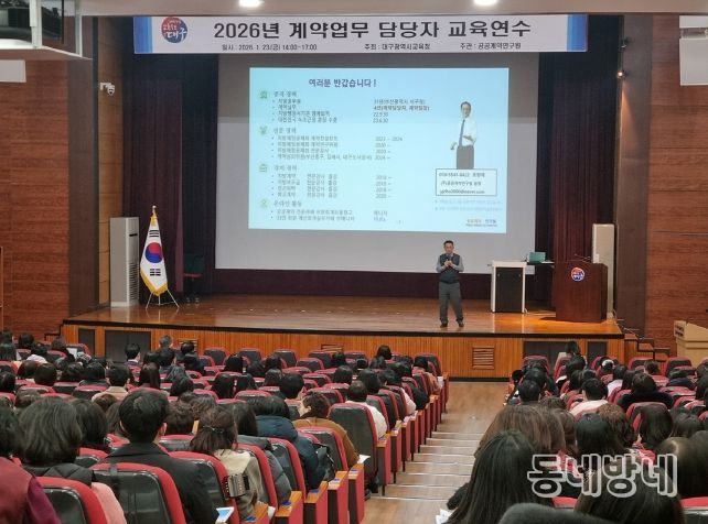 동네방네 김형규 기자 | 대구시교육청은 1월 23일 행복관에서 시교육청 산하 전 기관 계약업무 담당자 500여 명을 대상으로 실무 역량 강화를 위한 계약업무 담당자 연수를 실시하고, 계약업무 전문기관 활용 안내와 청렴 개선을 위한 당부 사항을 함께 전달한다.