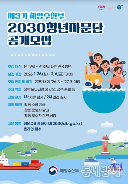 동네방네 김형규 기자 | 해양수산부는 해양수산 정책 전반에 대한 청년세대의 다양한 의견을 수렴하고 청년들의 정책 참여 기회를 확대하기 위해 1월 26일부터 2월 6일까지 ‘제3기 해양수산부 2030청년자문단’을 공개 모집한다고 밝혔다.
