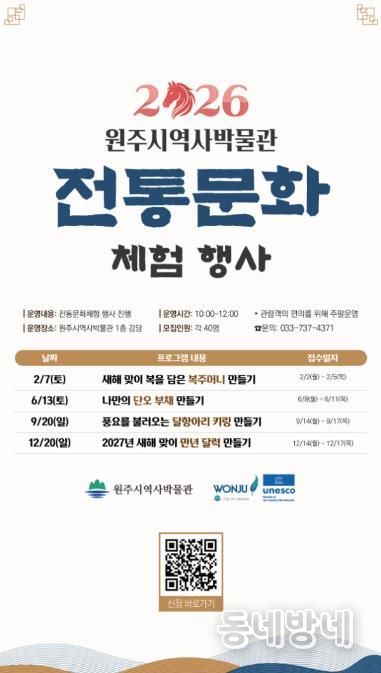 동네방네 김형규 기자 | 원주시역사박물관은 새해를 맞아 ‘2026 전통문화 체험 행사’를 운영한다.