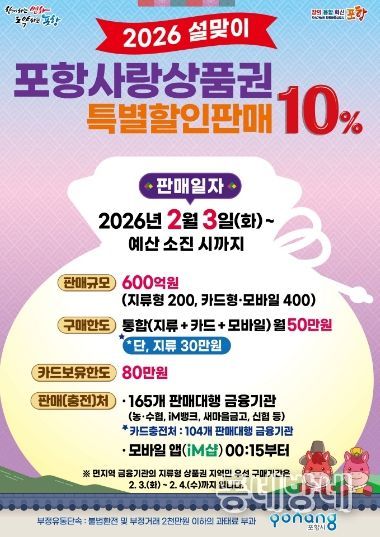 동네방네 김형규 기자 | 포항시는 설 명절을 맞아 민생경제에 활력을 불어넣기 위해 내달 3일부터 포항사랑상품권 600억 원을 10% 특별할인 판매한다.