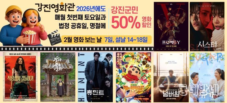 동네방네 김형규 기자 | 강진군이 민족의 대명절 설을 맞아 군민 모두가 부담 없이 영화를 즐길 수 있도록 오는 2월 7일과 2월 14일부터 18일까지 ‘2026년 영화 보는 날’ 행사를 운영한다.