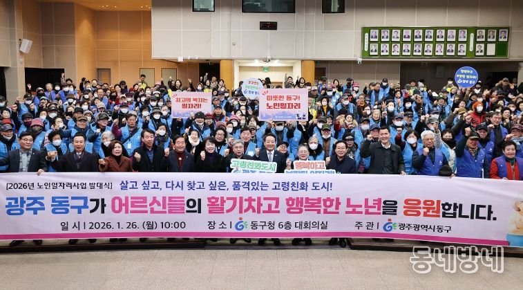 동네방네 김형규 기자 | 광주 동구는 26일 어르신들의 건강하고 행복한 사회참여를 지원하기 위한 ‘2026년 노인 일자리 및 사회활동 지원사업 발대식’을 열고, 올해 노인 일자리 사업의 본격적인 시작을 알렸다고 밝혔다.