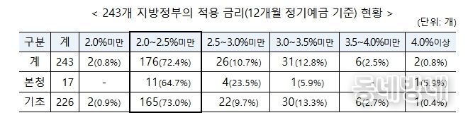 전국 243개 지방정부의 금고 이자율을 조사한 결과, 12개월 이상 정기예금 금리는 전국 평균 2.53%(공개 이자율 기준)로 집계됐다.